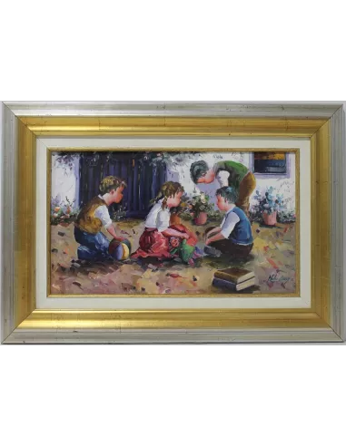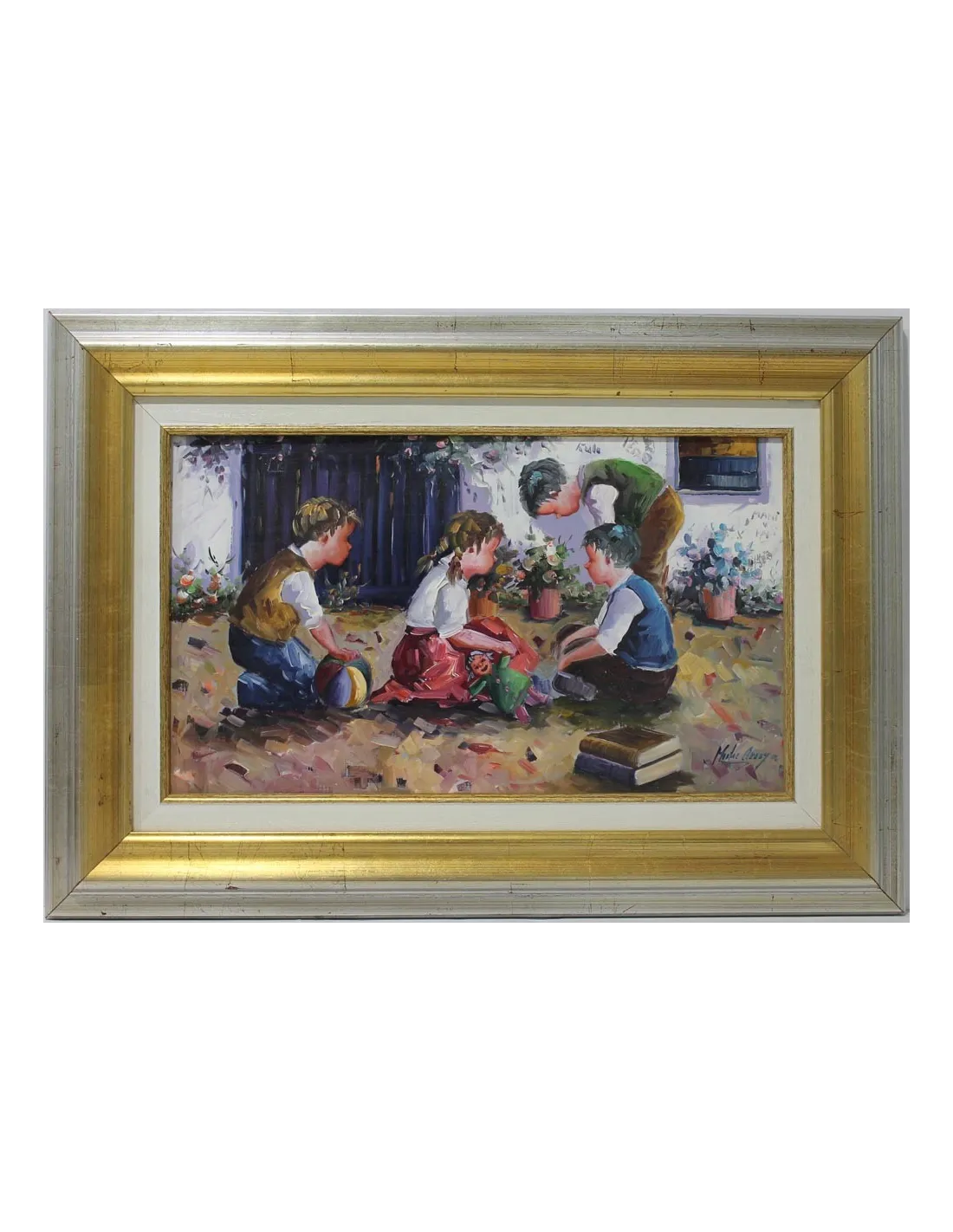 Impressionist painting of rich color and perfect drawing, a sympathetic theme that reminds us of times of yesteryear.