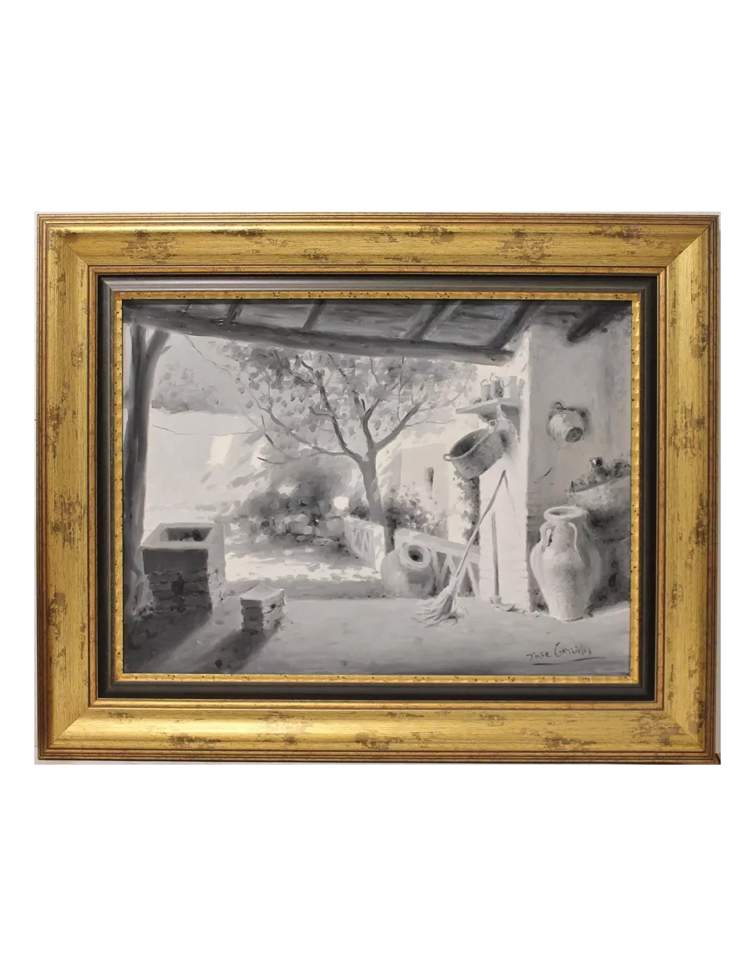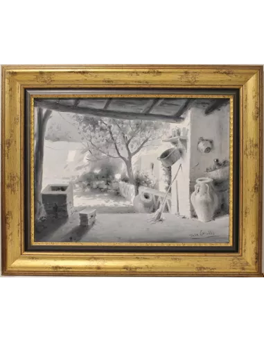 Magnífica obra que firma este más que cotizado artista Cordobés. Ante su pintura no se sabe qué admirar más, si la seguridad del dibujo, la gracia con que están concebidas las escenas, las perfectas composiciones, o la delicada captación de las luces y sombras, envueltas en suaves y plateados grises.