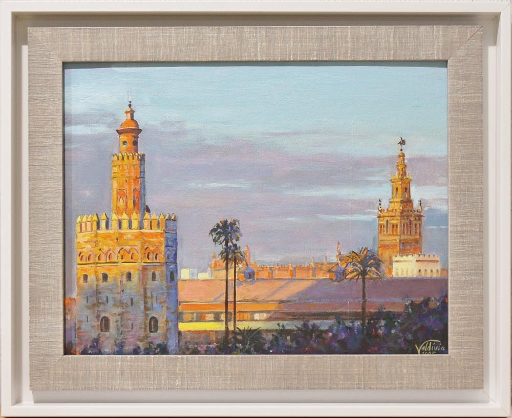 Genial representación del conjunto monumental de la Torre del Oro y La Giralda, con unos colores cálidos que evocan un atardecer primaveral.